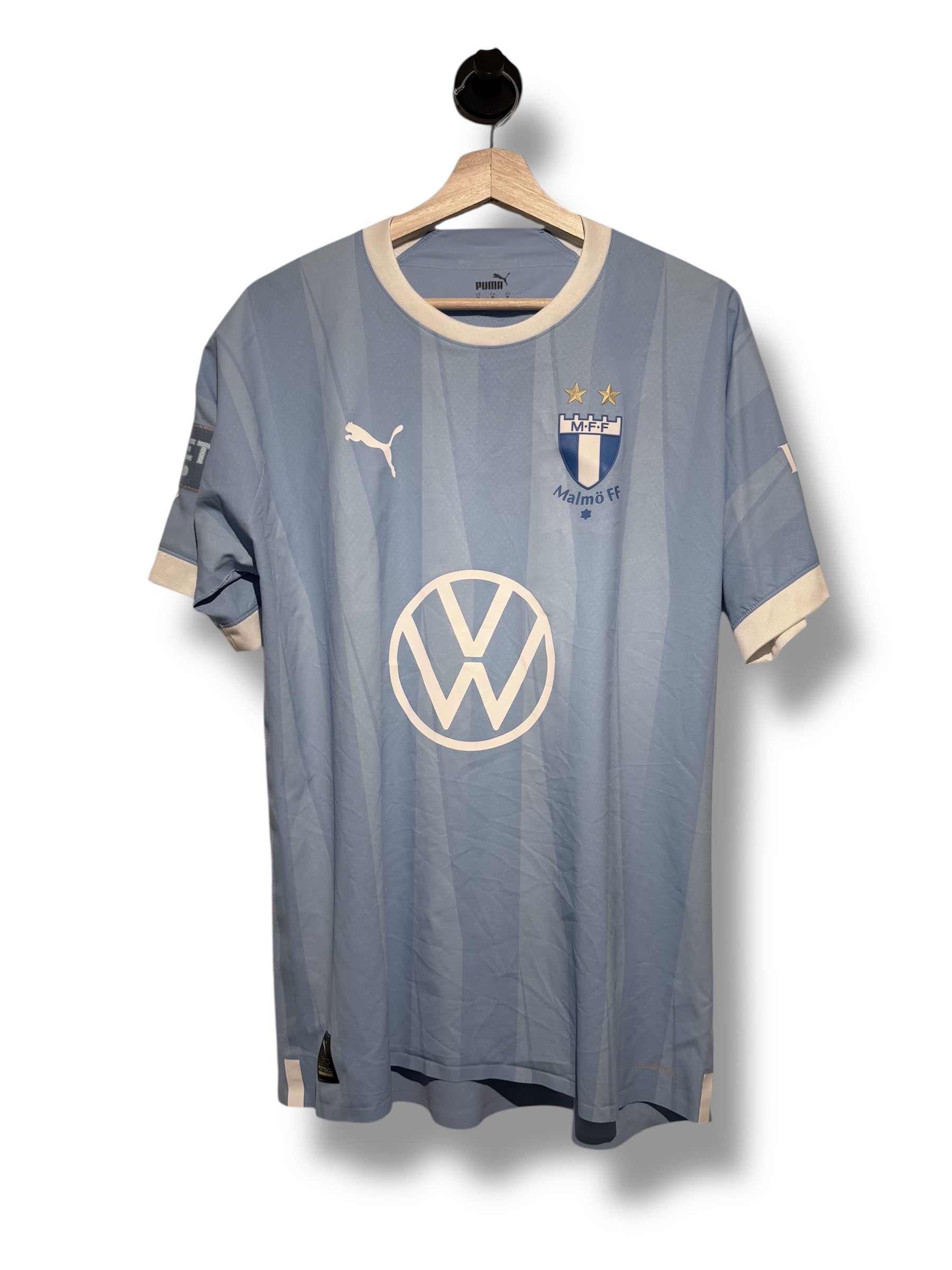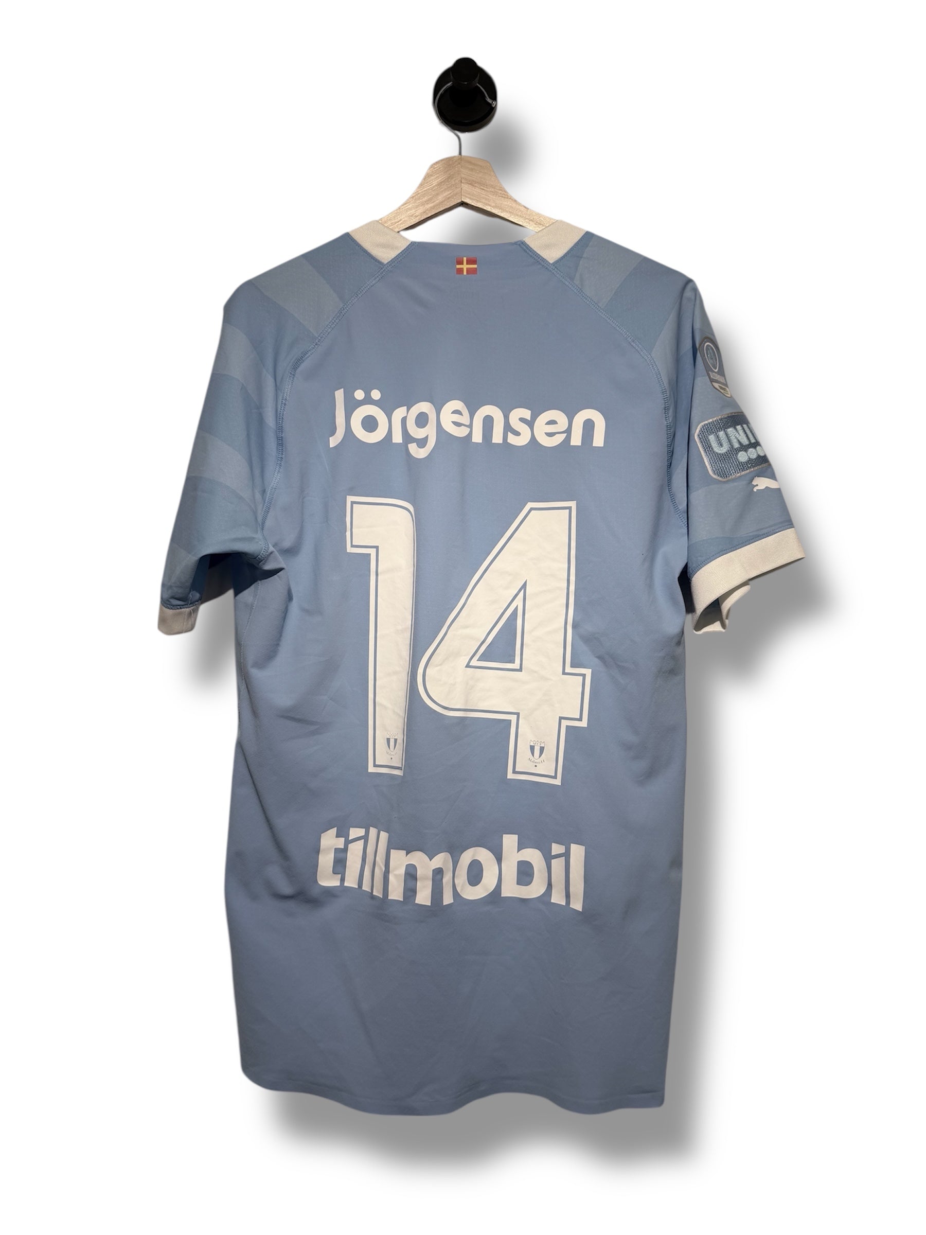 Original matchworn home shirt from Malmö FF's 2023 season featuring Sebastian Jörgensen. This authentic vintage football shirt has been used in a match and features the iconic light blue design.